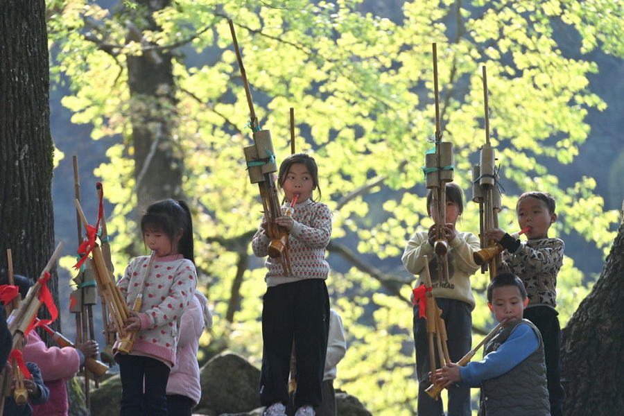 在广西融水苗族自治县杆洞乡党鸠村,小学生在“芦笙文化进校园活动”中吹奏芦笙(2025年3月28日摄)。近年来,融水在广东省廉江市结对帮扶下,通过基础设施建设、非遗进校园、夜校人才培养、民俗交流活动等举措,保护和传承当地特色芦笙文化。