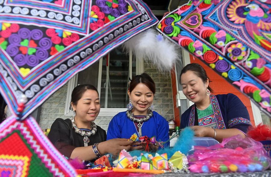 侗族吉祥花是广西三江侗族自治县的传统手工艺品,融侗族印染、刺绣、织锦等技艺于一体,是极具民族特色的吉祥饰品。近年来,当地积极研发吉祥花主题文旅产品,销售规模不断扩大。这是三江县八江镇三团村村民在探讨侗族吉祥花制作技艺(2025年9月24日摄)。