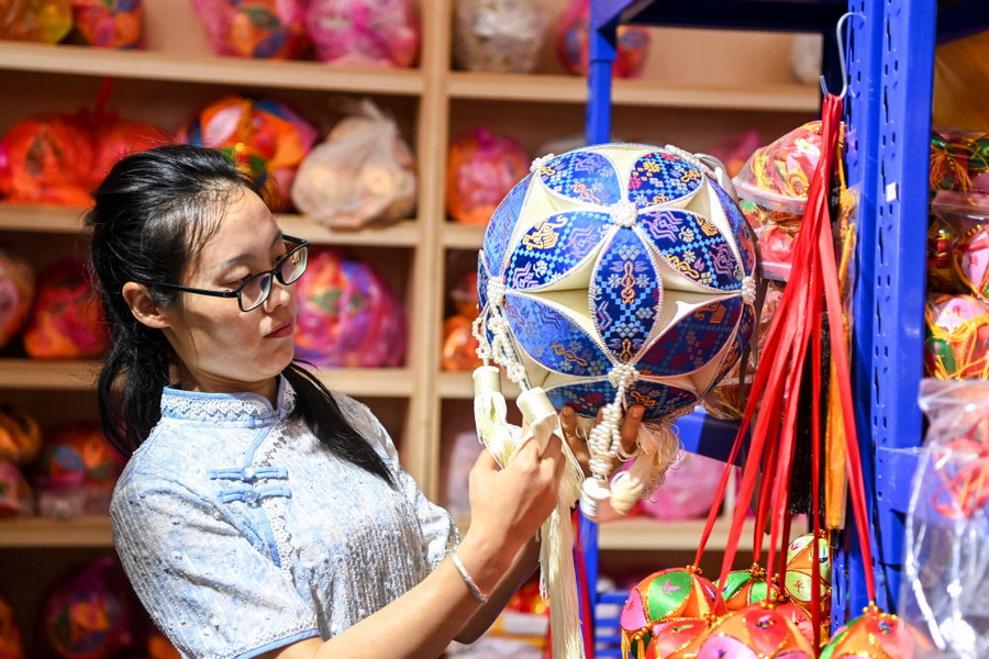 2024年4月3日,在广西靖西市的一家绣球生产企业,总工艺师王秀芬在检查绣球成品的质量。位于广西西南部的靖西市,有着悠久的绣球制作历史。如今,绣球这一文化符号与旅游产业深度融合,已经成为当地实现乡村振兴和经济转型的重要抓手。