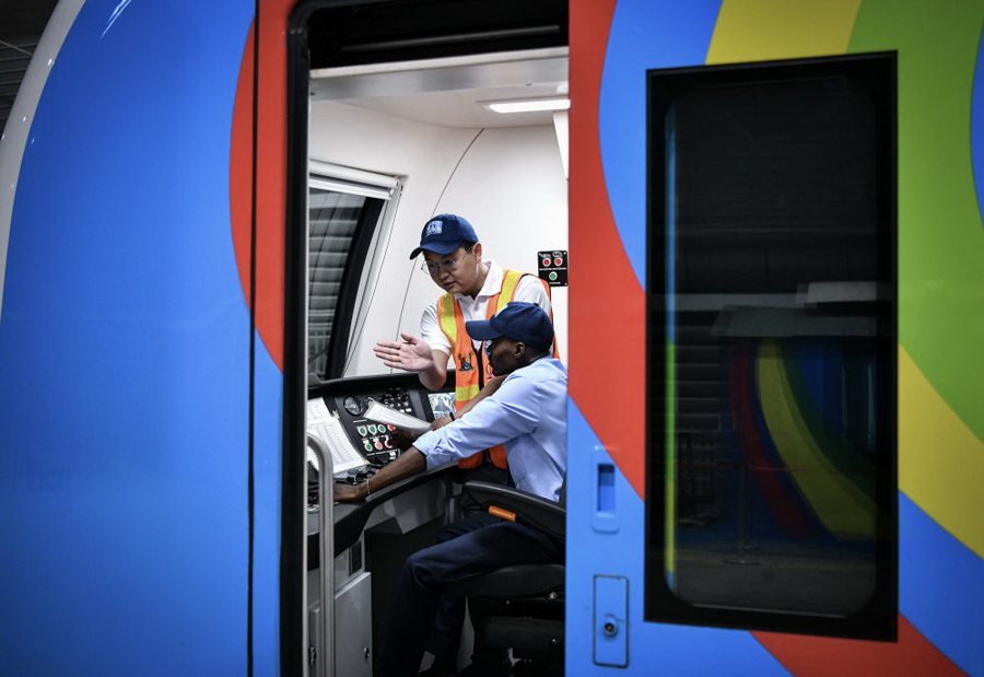 2024年3月3日,在尼日利亚拉各斯,中国师傅王奥飞(后)在轻轨蓝线列车驾驶室指导见习司机阿旺甘斯驾驶技能。拉各斯轻轨蓝线是西非地区首条由中国企业自主设计、建造、施工、运营的电气化城市轨道交通项目,由中国土木尼日利亚有限公司承建。蓝线所采用的全电力列车为通勤者提供了绿色、环保和节能的出行方式,缩短了出行时间,提高了市民生活质量。