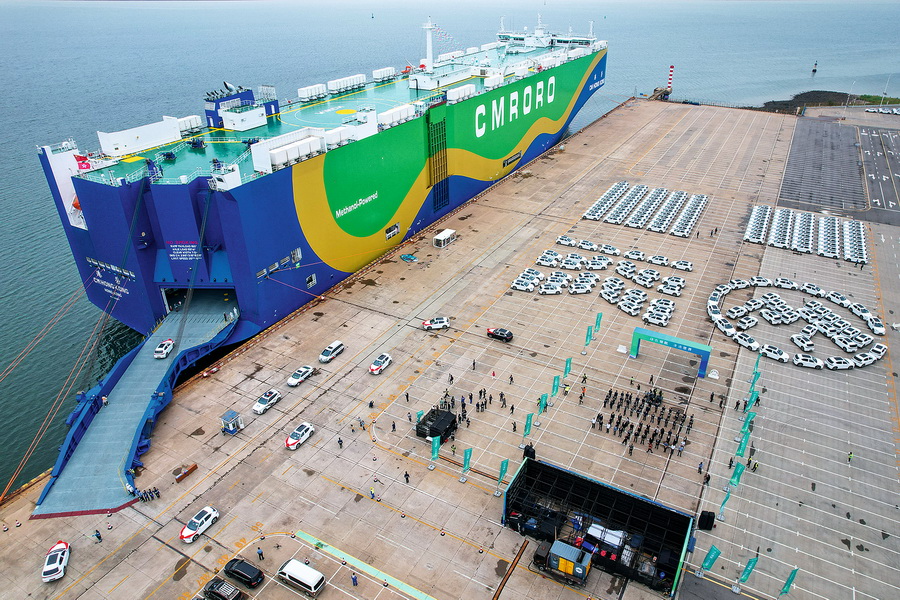 全球首艘9300CEU(标准车位)甲醇双燃料动力滚装船“港荣”轮在天津港靠泊装车并进行绿色甲醇加注作业。此次首航, “港荣”轮装载中国产汽车、大型设备等驶往欧洲。 视觉中国 供图