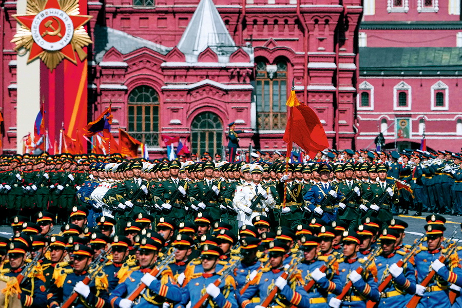 中国人民解放军三军仪仗队方队在俄罗斯首都莫斯科参加纪念苏联伟大卫国战争胜利80周年阅兵式。 视觉中国 供图