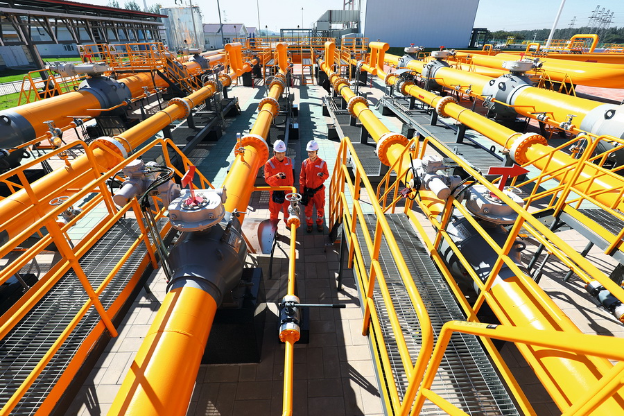 在国家管网唐山联络压气站内,技术人员在对中俄东线天然气管道线路设备设施进行日常巡检。2014年5月21日,中俄在上海签署两国政府东线天然气合作项目备忘录、中俄东线供气购销合同两份能源领域重要合作文件。双方商定,俄罗斯通过中俄天然气管道东线向中国供气。 视觉中国 供图