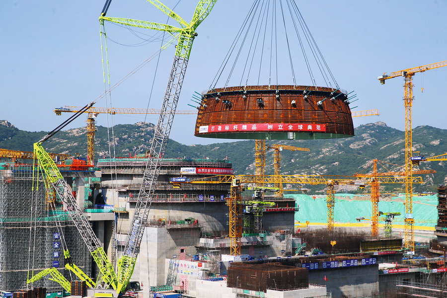 在江苏省连云港市连云区的田湾核电站,2000吨履带式吊车正在吊装中核集团田湾核电7号机组穹顶球带。田湾核电站是中俄两国政府加深政治互信、加强国际战略协作的标志性工程,对于继续深化中俄新时代全面战略协作伙伴关系,促进两国经济社会发展具有深远意义。 视觉中国 供图