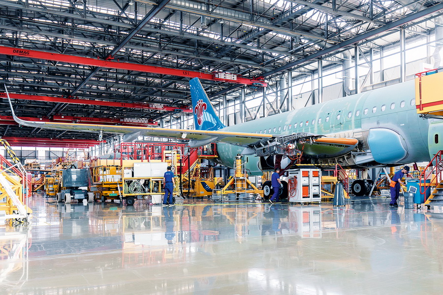 空中客车天津总装线于2008年投入运营,是空中客车在欧洲以外设立的首条民用飞机生产线,截至今年10月下旬已总装并交付780余架A320系列飞机,成为中欧合作的成功典范。 视觉中国 供图
