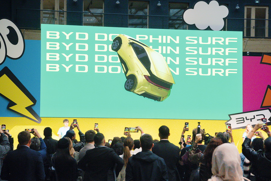 中国新能源汽车品牌比亚迪在法国巴黎举行发布会。数据显示,今年第一季度,中国汽车品牌在欧洲国家的销量同比增长78%。欧洲汽车制造商协会的数据表明,中国是欧盟第三大汽车出口市场,仅次于英国和美国。作为全球两大重要的汽车市场,中欧以技术合作为纽带、以绿色产能为引擎,在汽车产业电动化、智能化变革中相互学习借鉴、实现互利共赢。 视觉中国 供图