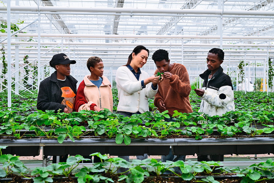在浙江金华市双龙实验室蔬菜农艺农机融合示范试验基地内,金华职业技术大学的非洲留学生在多元生态立体种植示范中心开展草莓种植技术实训。 视觉中国 供图