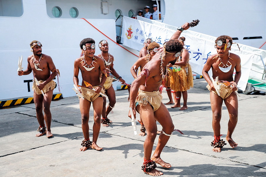 中国海军“和平方舟”号医院船抵达所罗门群岛首都霍尼亚拉,当地举行传统表演表示欢迎。 视觉中国 供图
