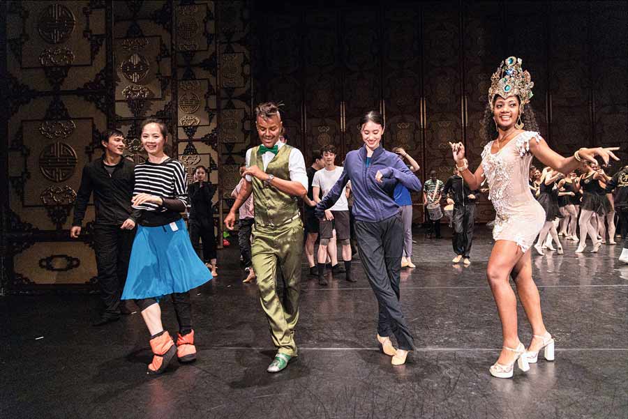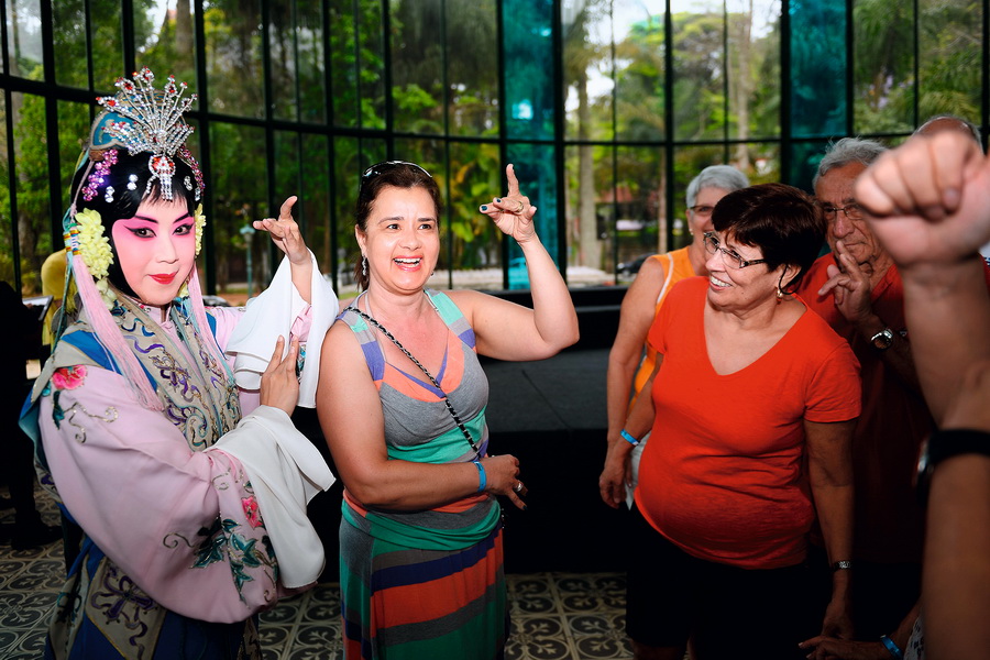 在巴西彼得罗佩雷斯市中心的“水晶宫”,京剧演员教当地民众如何摆身段。 摄影 金良快/新华社