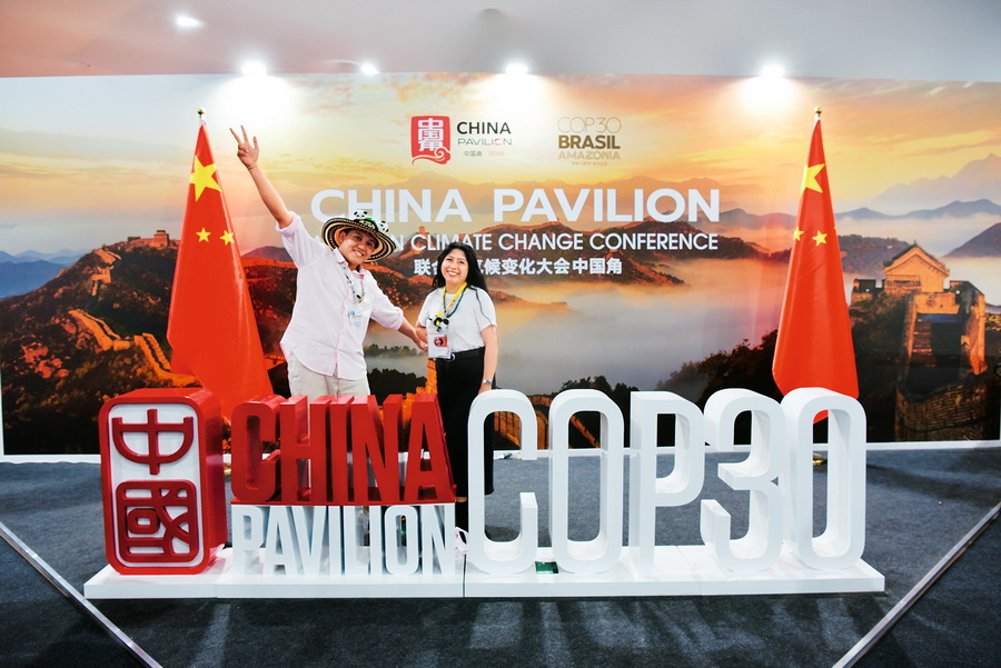 《联合国气候变化框架公约》第30次缔约方大会(COP30)在巴西贝伦举行,中国角展现中国长城美景,吸引外国参会青年留影。 视觉中国 供图