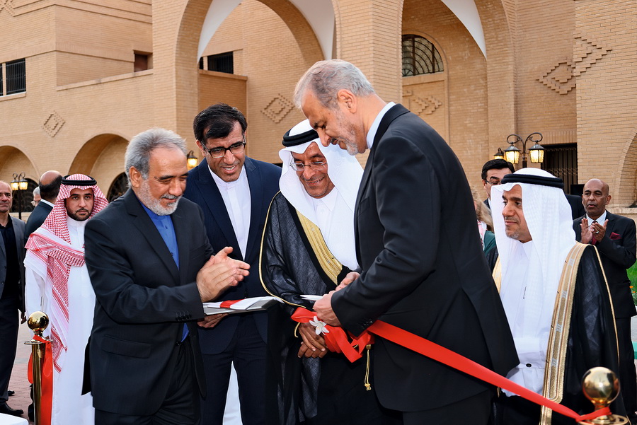 在沙特阿拉伯利雅得,伊朗副外长比格德利(前右一)、沙特副外交大臣优素福(前右二)等出席伊朗驻沙特阿拉伯大使馆复馆仪式。2023年3月,沙特和伊朗在中国支持和推动下达成历史性和解,恢复了中断7年之久的外交关系。 摄影 王海洲/新华社