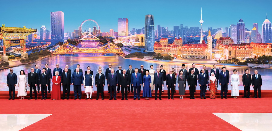 2025年9月1日,上海合作组织成员国元首理事会第二十五次会议在天津梅江会展中心举行。中国国家主席习近平主持会议并发表题为《牢记初心使命 开创美好未来》的重要讲话。习近平同出席会议的上海合作组织成员国领导人、常设机构负责人集体合影。 摄影 黄敬文/新华社
