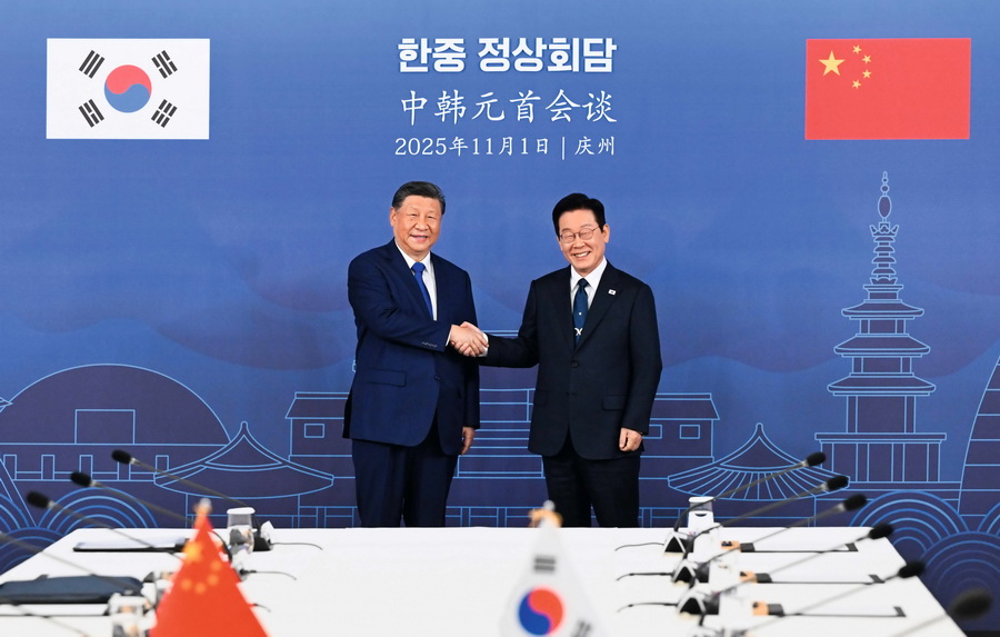 当地时间2025年11月1日,韩国总统李在明同中国国家主席习近平在庆州博物馆举行会谈。 摄影 申宏/新华社