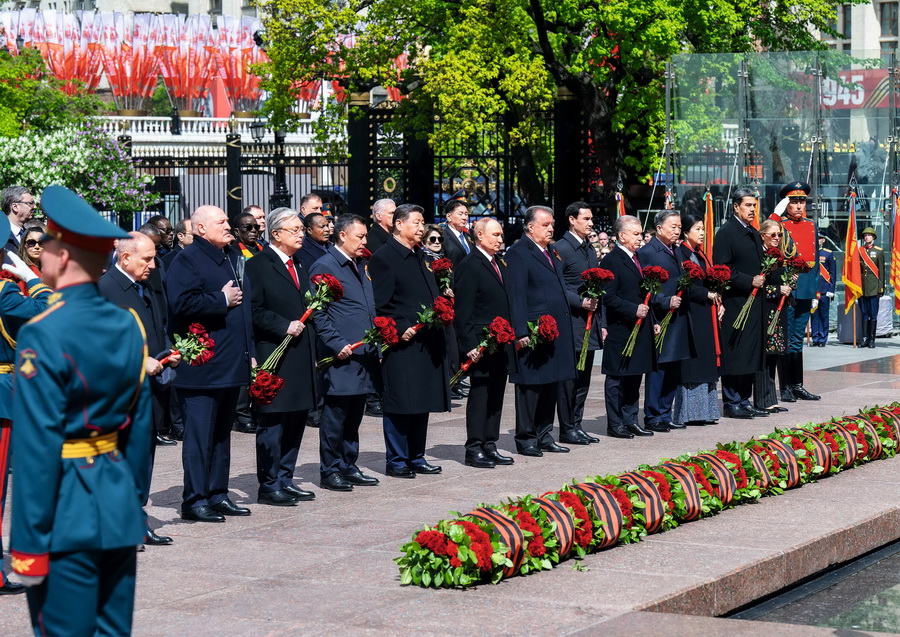 当地时间2025年5月9日,俄罗斯举行盛大庆典,纪念苏联伟大卫国战争胜利80周年。中国国家主席习近平和来自世界20多个国家及国际组织领导人应邀出席庆典。庆典结束后,习近平同其他国家领导人一起从红场来到亚历山大花园,向无名烈士墓献花,并肃立默哀。 摄影 翟健岚/新华社