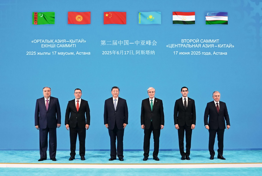 当地时间2025年6月17日下午,第二届中国—中亚峰会在阿斯塔纳独立宫举行。哈萨克斯坦总统托卡耶夫主持会议。中国国家主席习近平、吉尔吉斯斯坦总统扎帕罗夫、塔吉克斯坦总统拉赫蒙、土库曼斯坦总统别尔德穆哈梅多夫、乌兹别克斯坦总统米尔济约耶夫出席。习近平同中亚五国元首集体合影。 摄影 谢环驰/新华社