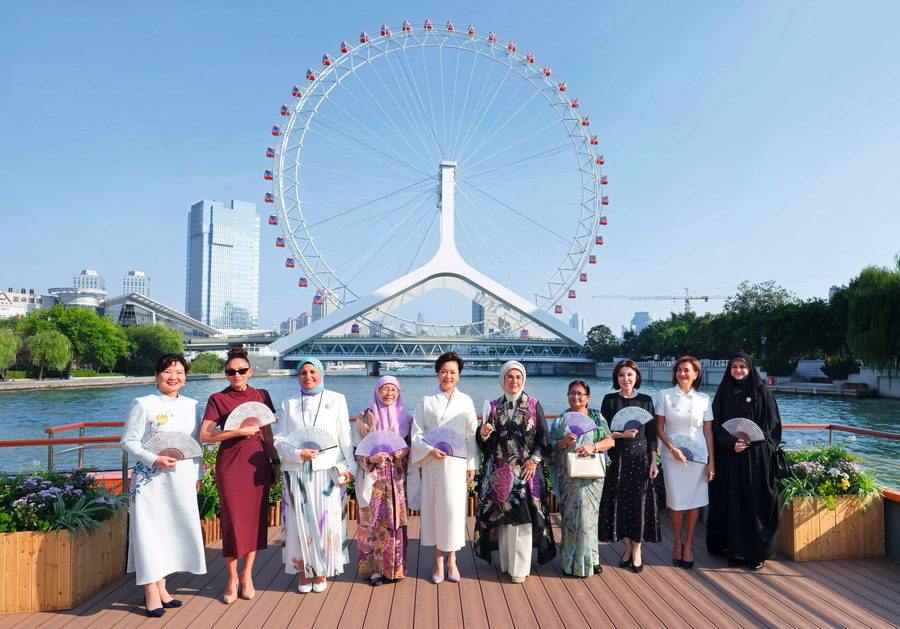 2025年9月1日,国家主席习近平夫人彭丽媛邀请出席2025年上海合作组织峰会的外方领导人夫人等共同游览天津海河。彭丽媛和来宾们登上游船甲板并合影留念。 摄影 丁林/新华社