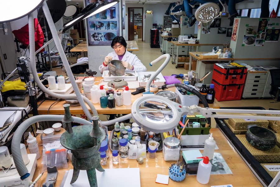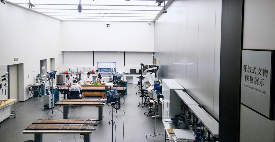 上海博物馆东馆文物保护修复体验馆以开放式文物修复展示和主题陈列的方式为公众揭开文物保护修复工作的神秘面纱。 摄影 董芳/人民画报