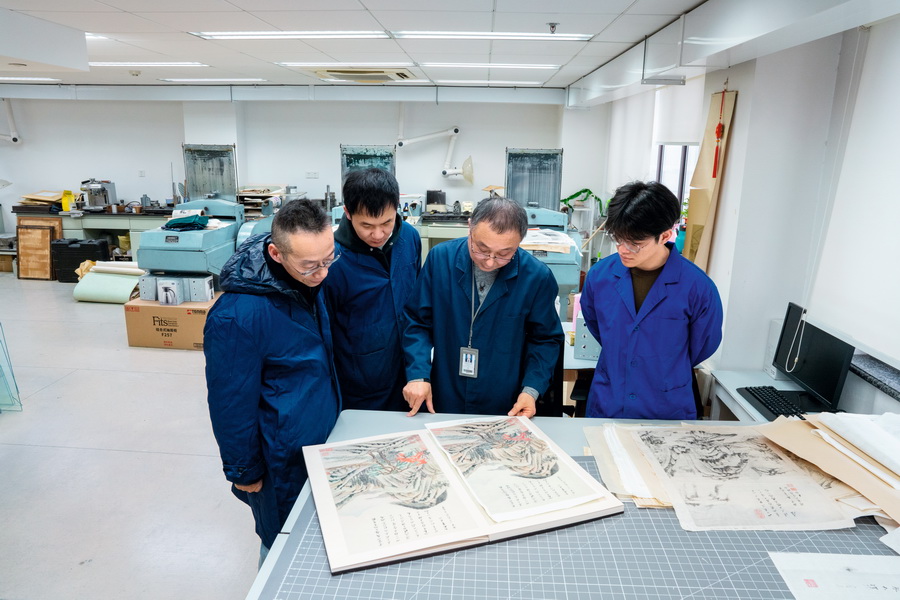 2025年12月25日,曹军(右二)与团队成员讨论使用珂罗版复制的董其昌《秋兴八景图册》。 摄影 徐讯/人民画报