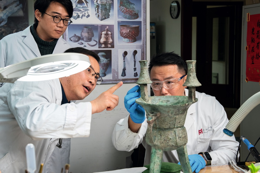2025年12月24日,上海博物馆文物保护科技中心器物修复研究室,文保科技中心副主任、研究馆员丁忠明(左一)与张珮琛(右一)讨论青铜器的修复。 摄影 徐讯/人民画报