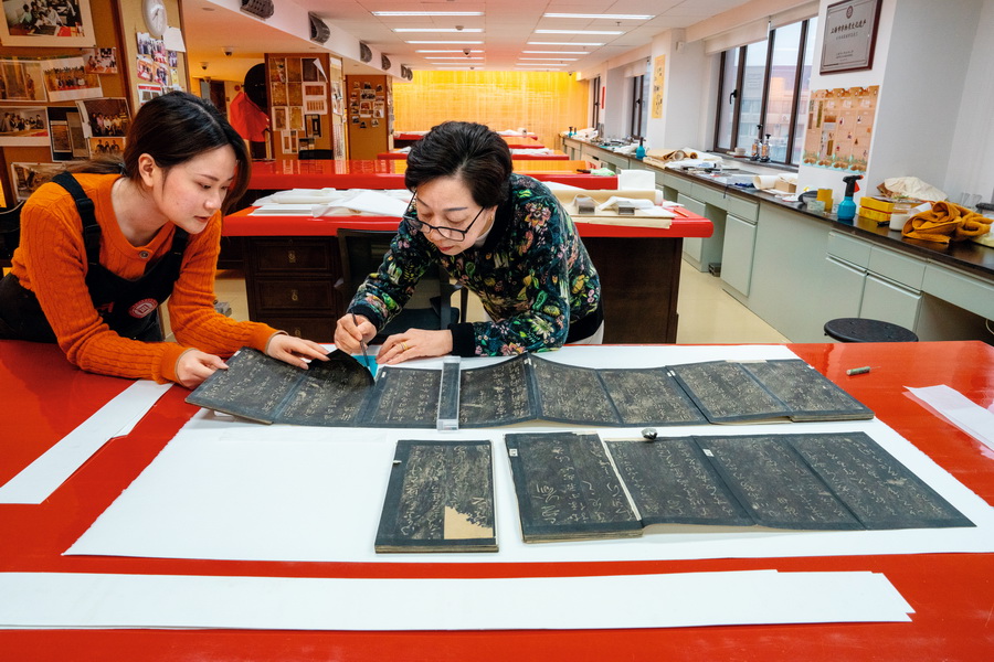2025年12月24日,上海博物馆文保科技中心古书画修复研究室,黄瑛(右)与徒弟俞简佳正在修复文物《宋拓淳化阁帖册》。 摄影 徐讯/人民画报