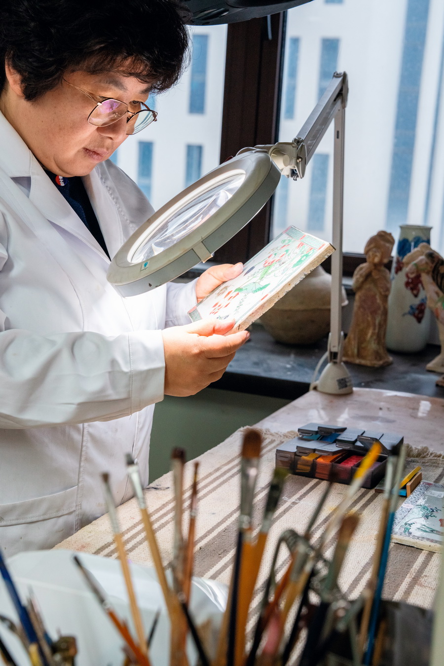 2025年12月24日,上海博物馆文保科技中心器物修复研究室,杨蕴在检查陶瓷文物的修复情况。摄影 徐讯/人民画报