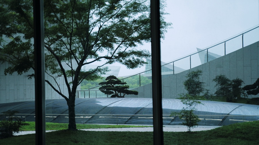 上海博物馆东馆的每一楼层都有大面积的落地玻璃、平台与户外区域。上海博物馆东馆中国历代绘画馆外。