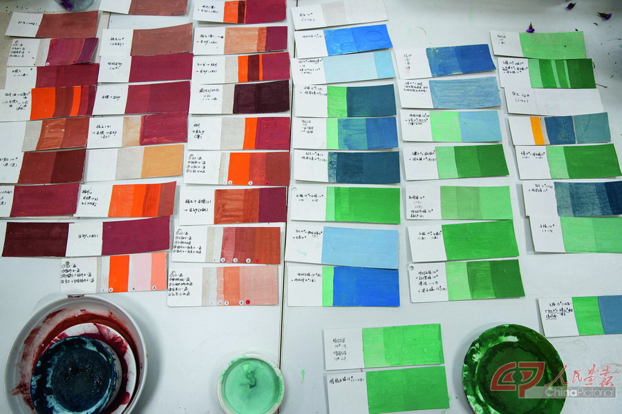 “以前只接触了塑,色彩这块接触得少,所以需要恶补。” 付祥波接触着色仅两个多月,度过了一段煎熬的时间。“在这里,每个人对古人用色都有自己的理解,也都有各自的用色习惯。就像铅丹,有人鼓励用铅丹,有人不太鼓励用铅丹,最终的选择还是要由自己来确定。”他制作色卡,在同时期的石窟里寻找参照,在平板电脑上试色,向同事请教。塑像有单独的空间,付祥波却在壁画临摹室里为塑像上色。