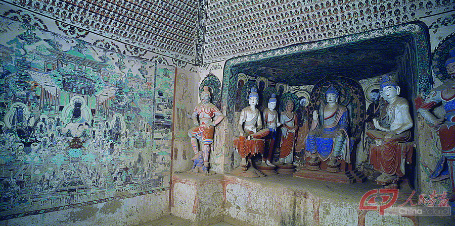 10世纪前后,中原大地上战乱不断,地处边陲的敦煌,相对来说比较安定。当时统治这一地区的曹氏家族笃信佛教,在莫高窟开凿了不少规模较大的洞窟,曹氏在敦煌创造了具有独特风格的佛教文化,在莫高窟第55窟,依稀可见当时开窟的盛况。