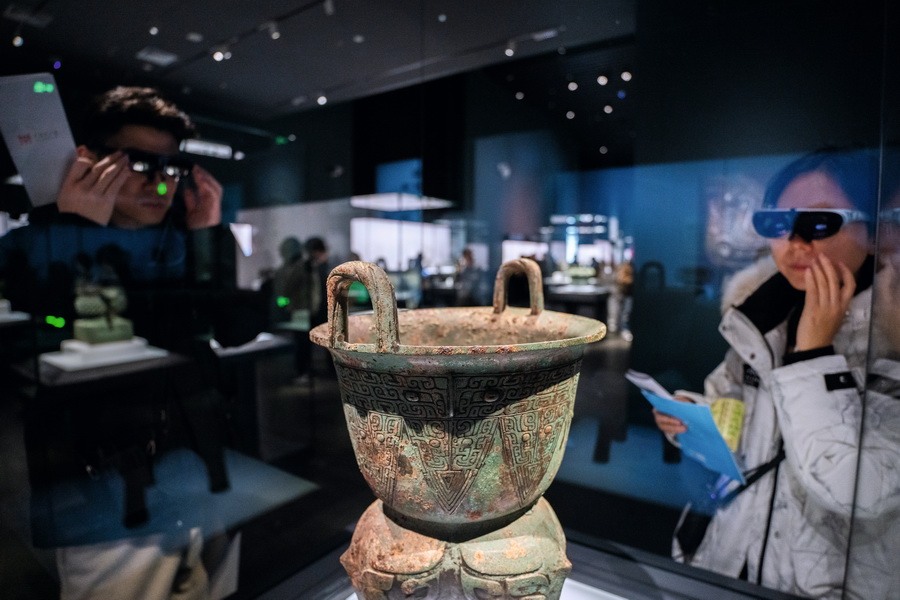2025年12月25日,上海博物馆东馆中国古代青铜馆,观众戴着AR眼镜了解展品。 摄影 徐讯/人民画报