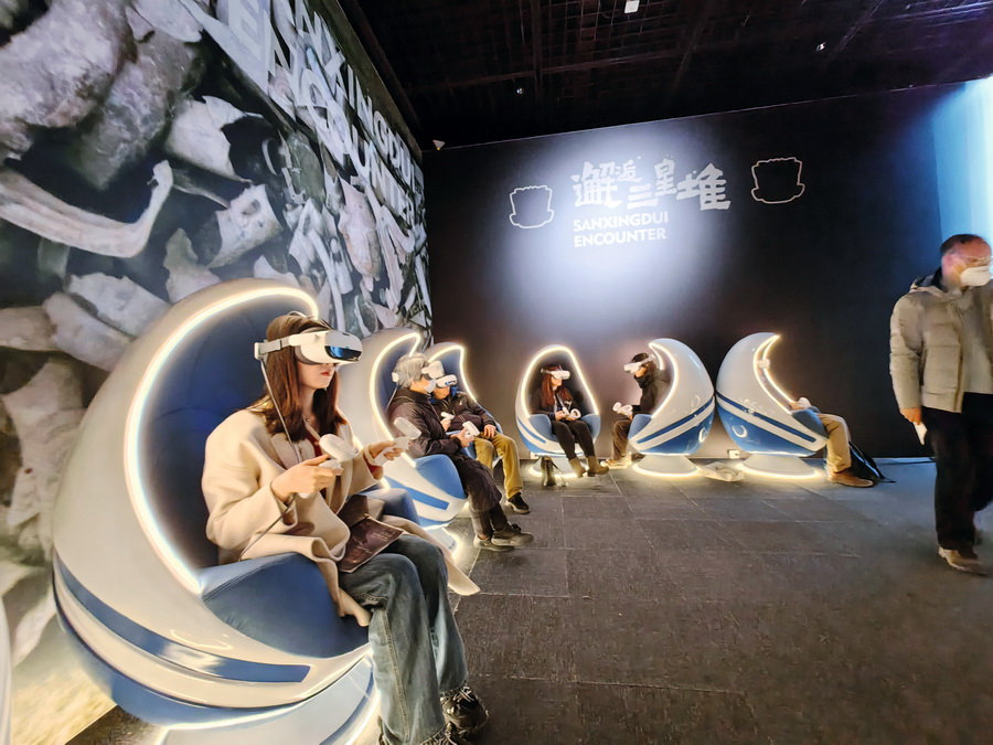 观众在上海博物馆通过VR眼镜沉浸式体验三星堆数字展。 视觉中国 供图
