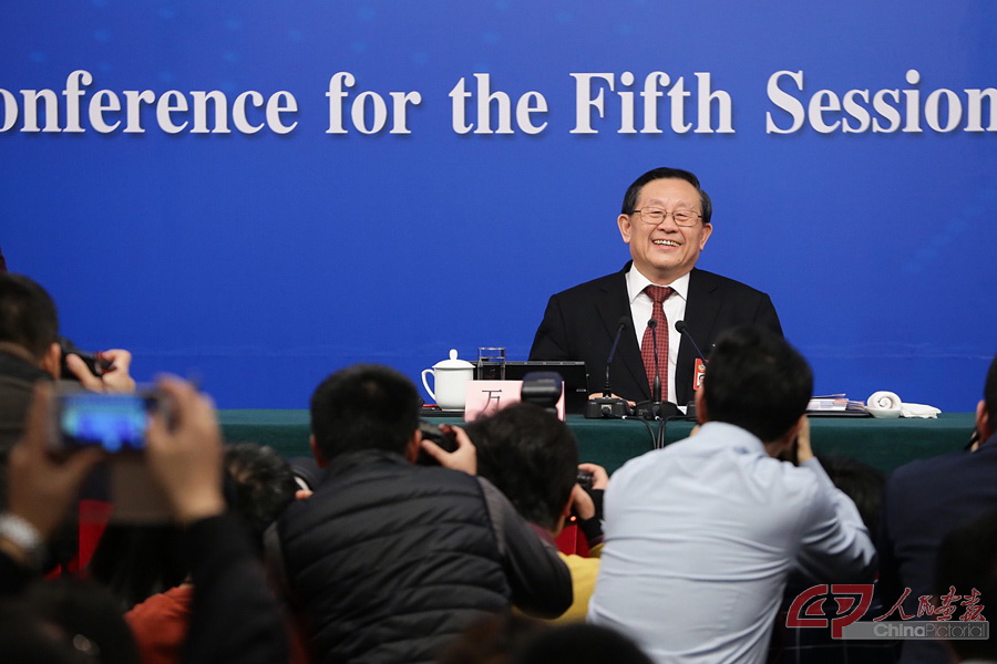 科技部部长万钢回答记者提问。摄影 徐讯/人民画报