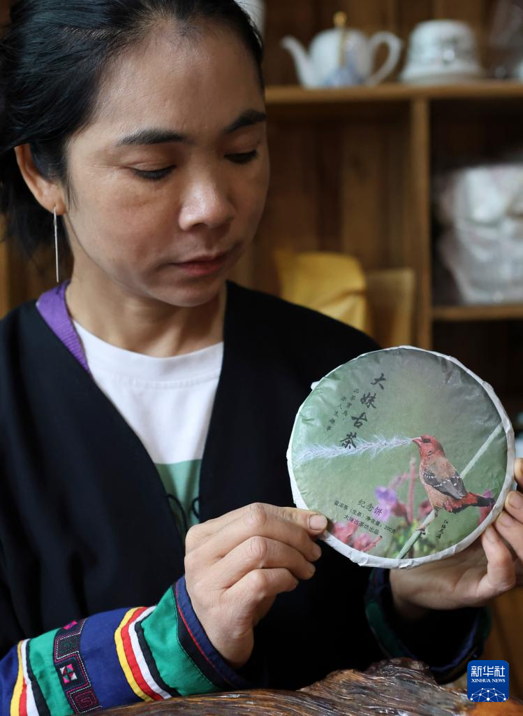 11月15日,景洪市勐龙镇勐宋村村民大妹展示她制作的普洱茶。红梅花雀图案的包装受到摄影师的青睐。