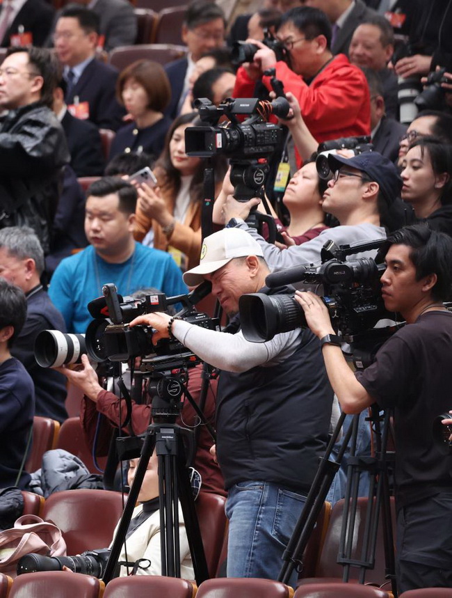 3月9日,十四届全国人大四次会议在北京人民大会堂举行第二次全体会议。这是记者在会场采访。