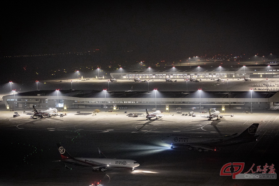 在塔台的指挥下,一架架货机有序排队起降。