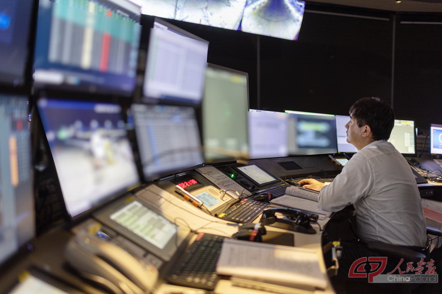 管制带班郭永杰(中)负责巡视检查各个席位的指挥情况,帮助解决席位管制员遇到的困难,保障运行安全。