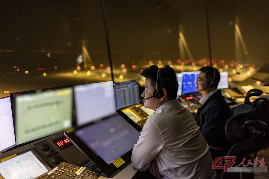 空中交通管制员主班(左)张虎指挥航空器滑行和起飞/降落,副班杜涛监听指令和复诵内容正确。