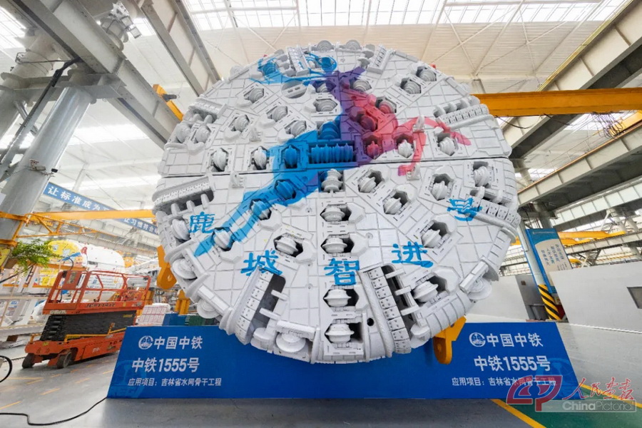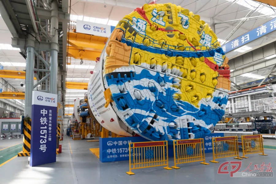 在中铁装备的总装车间,一台已经组装好的盾构机上画有浪花等图案。摄影 陈建/人民画报