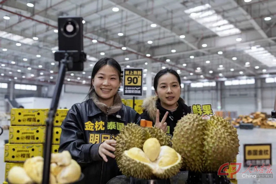 工作人员在花湖机场附近的冷链仓库直播,销售泰国金枕榴莲。依托“机坪直提”模式,泰国榴莲等生鲜货物,在鄂州花湖国际机场可以实现从原产地到餐桌的次日达。据统计,平均每天有超10吨泰国榴莲通过鄂州花湖国际机场入境。 摄影 段崴/人民画报