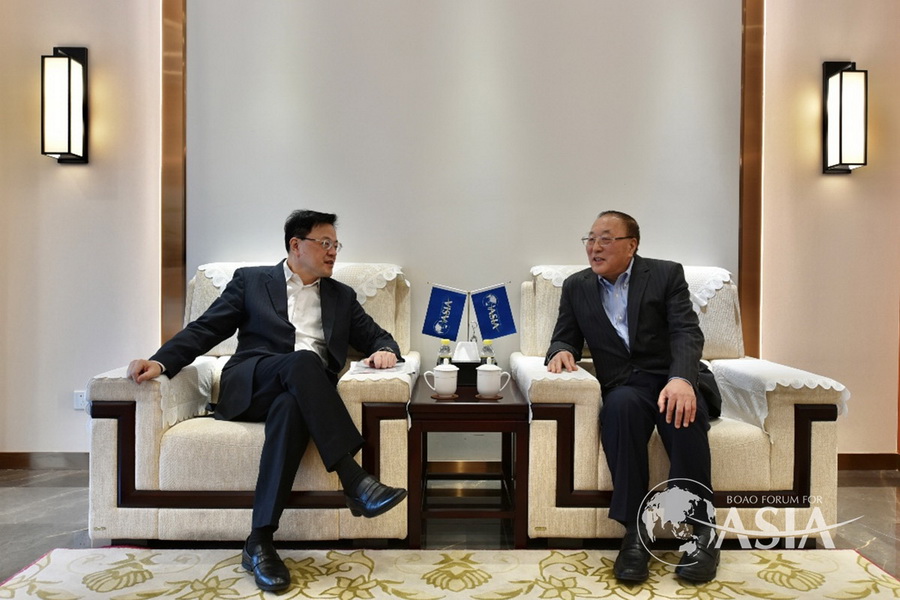 2月10日,博鳌亚洲论坛秘书长张军在论坛秘书处会见中远海运集团董事长万敏一行。中远海运总经理朱碧新以及博鳌亚洲论坛秘书处执行主任程霁等在座。