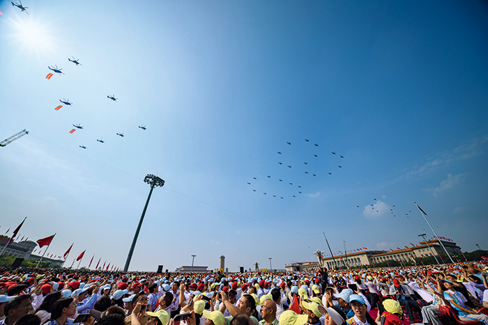 空中护旗梯队飞过天安门广场上空,拉开了阅兵分列式帷幕。摄影 段崴/人民画报