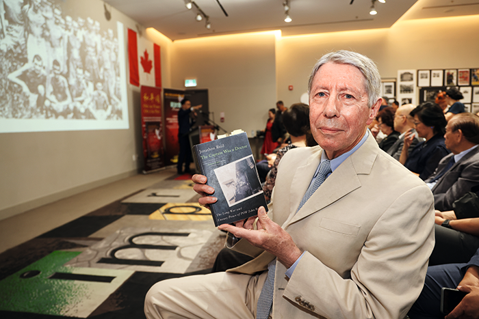 当地时间7月5日,加拿大多伦多,在纪念中国人民抗日战争暨世界反法西斯战争胜利80周年研讨会暨图片展上,加拿大香港保卫战退伍军人协会成员乔纳森·里德向记者展示他撰写的讲述其父参加香港保卫战并被日军俘虏经历的书作。 摄影 余瑞冬/中新社