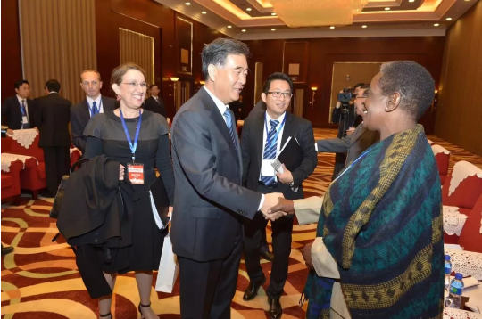 中共中央政治局常委、全国政协主席汪洋会见世界扶贫领域专家代表,后方陪同翻译人员为曲强。(图片由受访者本人提供)