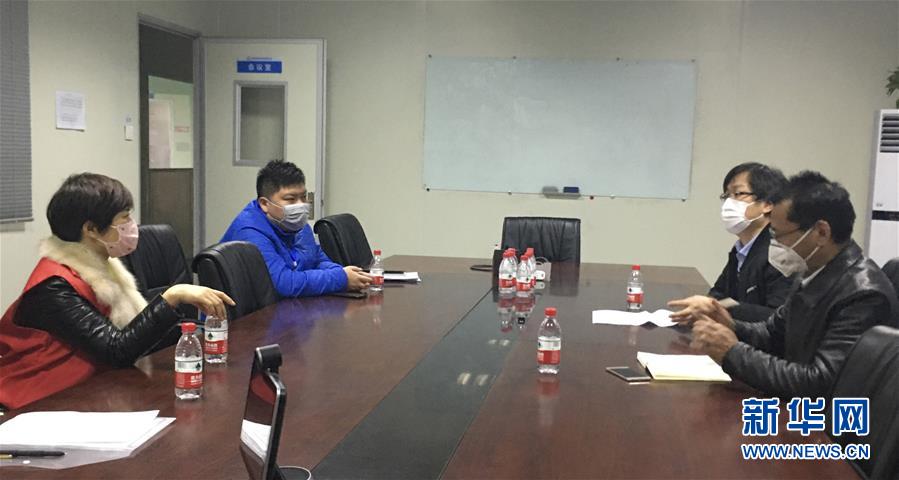 下沉干部孔祥梅(左一)与升越达公司负责人交流收集复工复产中需要解决的问题(2月24日摄)。新华社发