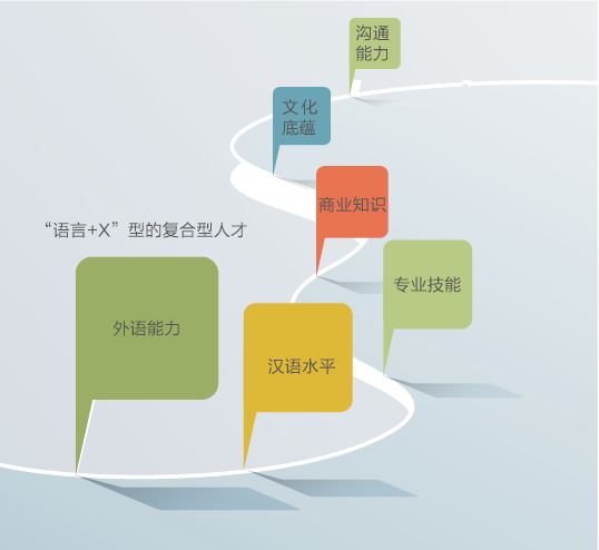 很多走出去的企业表示,因不懂语言、不懂当地文化背景,丢失不少合作项目和发展机会。同时他们也发现,要做生意,先交朋友。在很多时候,用当地人习惯的民族母语与之沟通交流,往往更容易融入对方的朋友圈,事半功倍。但仅仅掌握通用语言,如英语,是不够的,在“一带一路”倡议实施过程中,中国不仅需要精通外语的语言人才,更需要“语言+X”型的复合型人才。这里的X包括外语能力、汉语水平、专业技能、商业知识、文化底蕴、沟通能力等。